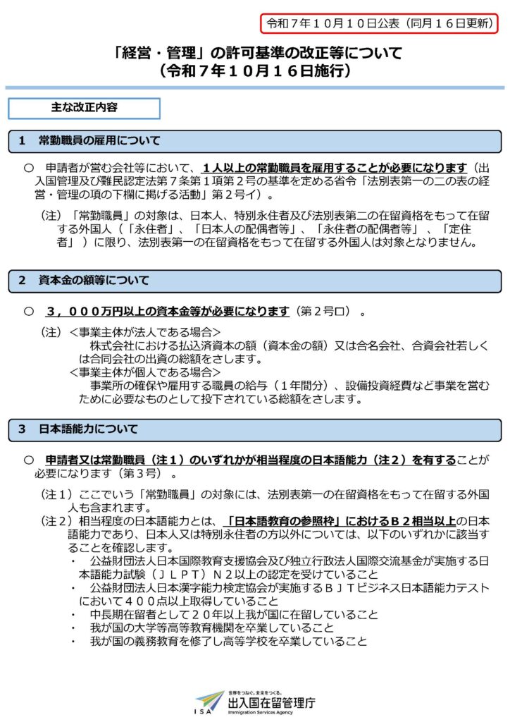 令和7年(2025年)10月16日から、外国人が日本で会社を経営・管理するための「経営・管理」在留資格に関する許可基準が大きく見直されます。 今回の改正では、これまで形式的な基準で取得できていたビザが、実質的な経営能力・財務計画・雇用体制を問われるようになります。
