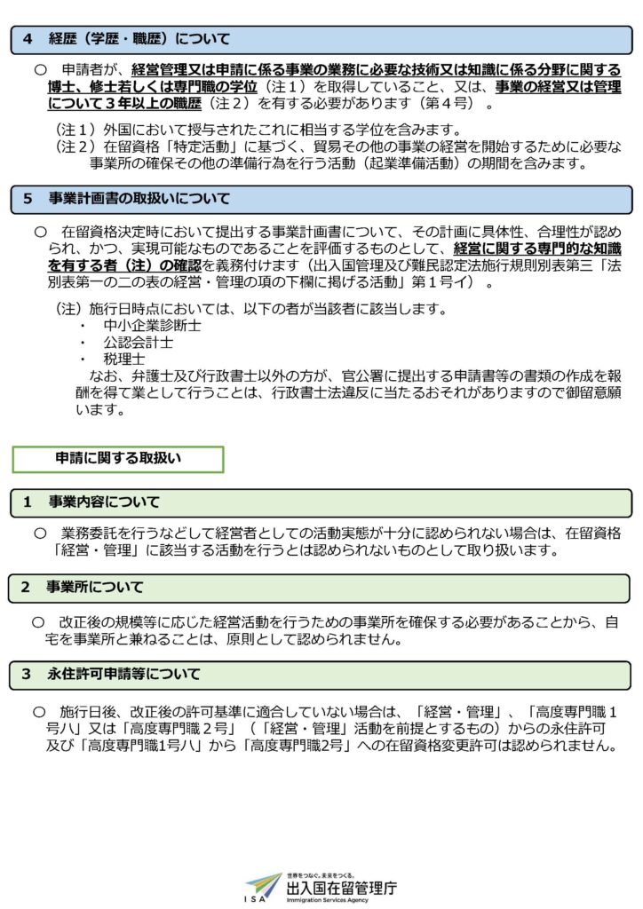 改正後の「経営・管理」ビザでは、事業計画書の内容が専門家によって評価・確認されていることが求められます。 これは申請者の計画が実行可能であるか、収益性があるか、雇用維持が現実的かといった点を、専門家の第三者的立場で判断してもらう仕組みです。